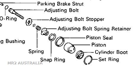 My left rear caliper handbrake cable had seized and the rear piston and disc badly overheated and were junk. When I looked for a replacement piston they are not available anywhere. The only option was a kit from the UK that included a new piston body and a circlip that can be used to retain the guts of a donor piston, Ebay "Rear Caliper Repair Kit & Pistons (41mm) For Toyota MR2 SW20 2.0 (1989-1991)". The guts of the donor piston are a screw and spring mechanism that form part of the handbrake action. In the next image these allow you to rebuild the "piston". This would have been a single integrated part from Toyota.