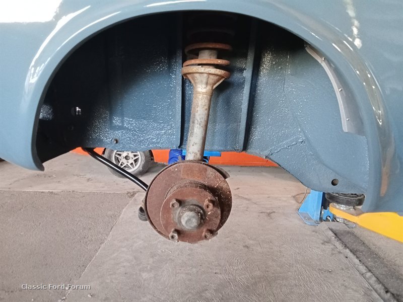 Yeah I hope so Deano, I'll think of covering it like yours so it's got the texture but hope it's not reactive to resins. Spent the best part of today swapping cars about, mk1 out and mk2 in since the mk2 will be very close to painting . Since I dragged my mk1 out of the painting room, I thought it's not needing to be in the rotisserie anymore, I reckon it's been 6yrs on there. After cleaning and sweeping the area for some painting tomorrow, the mk1 was positioned over the hoist to make removal of the rotisserie a simple job instead of a frightening one like previously with the van .  Installed the wcxm with rack and lower arms, then the sway bar and front brackets, I don't the same truck as Mark, bringing the mounts forward 20mm , the original 1300 struts are in there till the car is mostly built so I can work out it's final ride height  Struts are a lot forward but that's at full droop  Rear leafs might be a little low , I had to drop the front bolts so I could slide the axle assembly in, the spring to chassis GSP wasn't big enough for the tiny 1300 brakes. Next is find a set of roller wheels