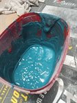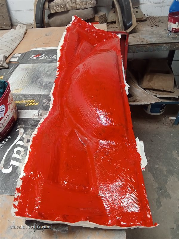 I got the gelcoat on the bulkhead cover in a nice red. Edit, it's not gelcoat, it's resin mixed with fumed silica beads to thicken up it's consistency then I added red pigment ( I try to have a colour that's not going to be used in the mold ) as it'll be hard to tell where I've brushed it on or missed spots which is a bad thing in fglassing. I'll give it another layer of resin just to make sure it's fully covered . The tape is to add extra area to help the glass stick to and will also strengthen the mold plus helps resin flow beyond the items edge , I can do a demo if interest calls..