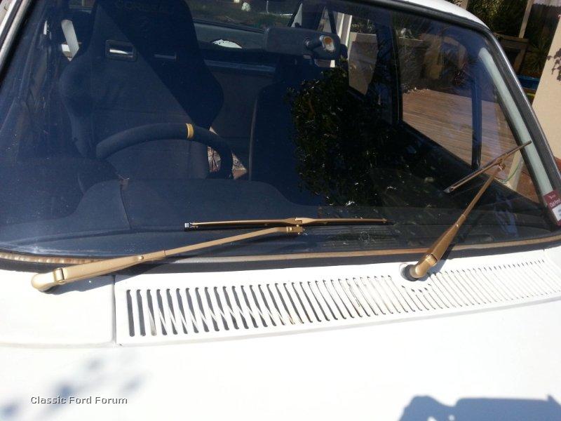All sorted. Bled the brakes and after a couple of small leaks sorted I am reasonably happy with it. Slightly spongy pedal which I suspect may be the M/Cylinder. Can still lock them up though. I also want to make an adjustable pushrod so I can adjust the height of the pedal to better heel and toe. Took it for a drive and all is good and I can even hear the engine noise now that I have a diff that makes no noise. Also the acceleration has increased markedly with the 3.89 diff too. The arse is still too high so I'm looking forward to when I get the springs so it all looks uniform. I got a bit happy with the sandblaster and did the wipers but I painted them gold! Not sure I like it but what can you do. Hopefully it behaves itself tomorrow night on the RSOC Vic January Cruise. Cheers, Matt