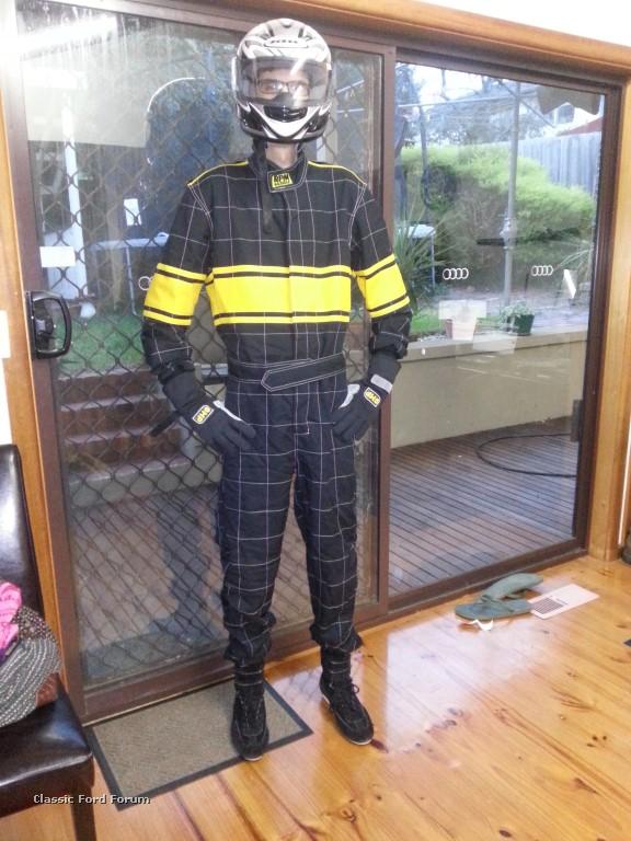 Has been quite a while since I have updated but things have still been happening. I sorted out the rear issues with the discs. The axle flange just needed to be turned down a little more. Thanks to Peter R this was done and all is good now. I dropped off the car today at a mates mechanics shop to get a few things sorted out once and for all - 1. The front end aligned again. This time with around 2degs camber and as much caster as we can get. The new springs ended up being a little too low with the lowering blocks in so they will be removed too. Also to sort out what is making the loud front end clunk. 2. I still have a somewhat spongy pedal and I am pretty sure it's not pad knock off / piston pull back as I have had a good look with someone else pushing the pedal and I don't see any movement at all from the caliper pistons so that leaves either poorly bled brakes or the m/c. Time will tell. I have chosen the 16th June at Sandown to be my first outing (just to need to sort out my cams licence) and as such I tried on my old race suit that I have had for years and have never used. It's a big baggier than it used to be but it'll do the job. Most guys don't even wear a race suit so I may not even wear it but it's fun to wear it round the house and the kids think I look cool too. I'll update again once I get the car back from the mechanics. (If it ever comes back!!!) Cheers, Matt