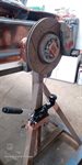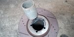 Time for a brake rotor upgrade, I saved the front rotors from my Focus ST for just such occasion, you can see the size difference, 235mm 1300mk1 rotor against a 320mm rotor !! The caliper is also an upgrade from the mk2 escort M16 caliper, the new one is from a Toyota land cruiser 4 piston..  Next is to start the plasma cutter up and cut the hole bigger, I thought my little cut 40 plasma wasn't going to do it but it actually needed turning down, I kept blasting till the tube went in with a little gap  It fits !!  Making a removable disk is to weld a plate to the spindle and another to the outer tube which the rotor is welded to, I used 2x 10mm bolts to take the stress.  This is the rotor about to be welded in place once I know the depth and to keep it square..