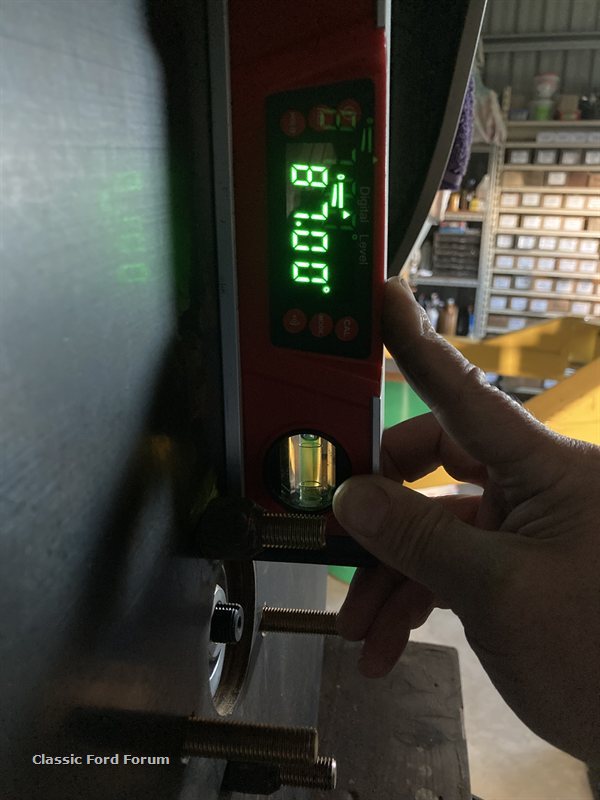 I'm running 3 deg +castor and 3 deg -camber on the track car. As I have only driven it on and off the car trailer I have no idea how it will drive. This was just the initial setup recommended to me. I have been using a digital spirit level and protractor for a while now and it makes life so easy. You should be able to get that angle between your red and blue line to the nearest degree I would think? As I mentioned before, I had to get the longer control arm ends, I think the steering rod ends will make it ok